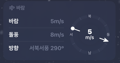 5 A.M, 평균 풍속은 5m/s (순간 풍속 8m/s)