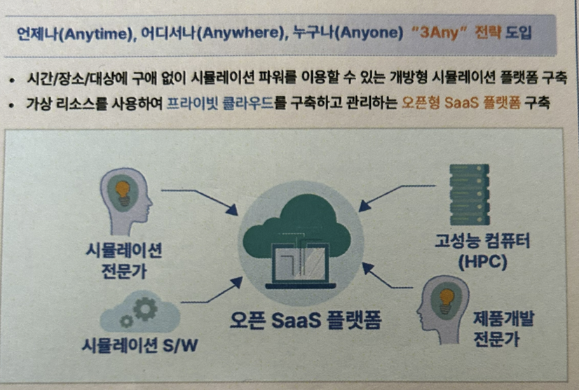 시뮬레이션을 위한 SW와 HW는 중소기업이 구매하기에 너무 비싸고 강력한 컴퓨팅 파워를 필요로 합니다. 그리고 인력 및 조직을 구성하여 관리하기도 어렵습니다. 오픈 SaaS (Software as a Service) 플랫폼은 이러한 중소기업의 어려움을 해결하기 위해 필요할 때 필요한 만큼만 사용할 수 있도록 주요 시뮬레이션 SW가 탑재된 오픈 SaaS 플랫폼을 제공하고  관련 전문가를 지원합니다.