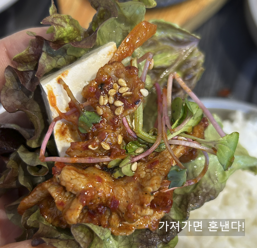 제육두루치기, 직화에 볶은 것인지 불 향이 나요. 양념이 적절하고 고기 맛이 좋았습니다. 아래 손두부와 함께 쌈, 콩나물과 같이 먹으면 더 맛있어요.