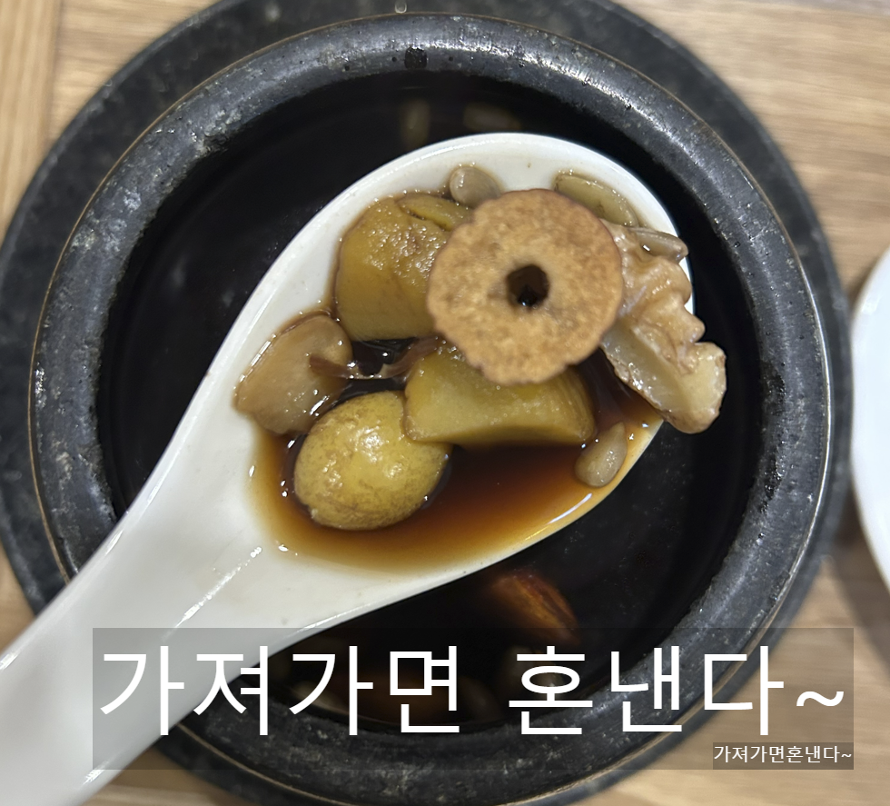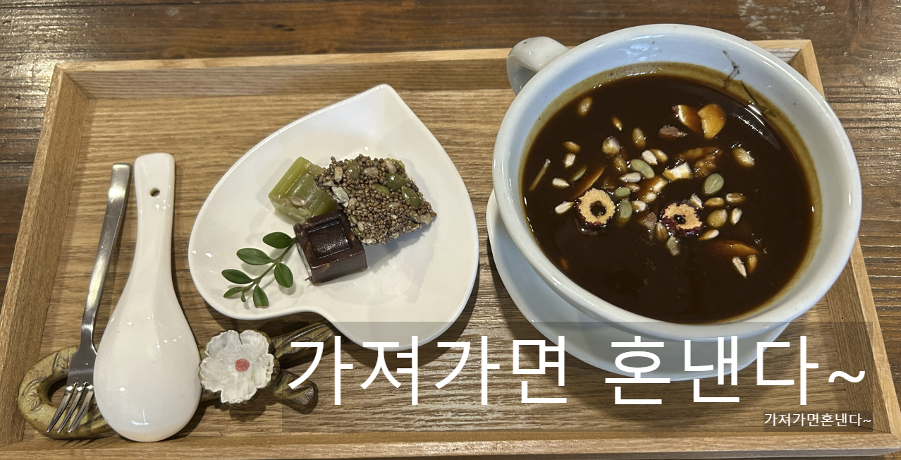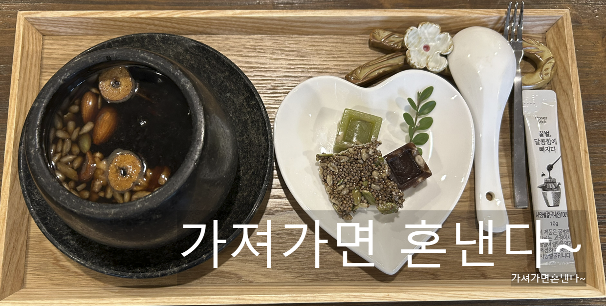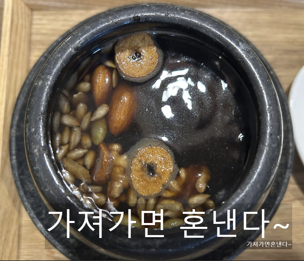 윤석열이 내린 사약인 줄 알았어요.^^ 그런데 가만히 보니 다양한 견과류 (밤, 잣, 호두 등)이 들어가 있어요. 다행히 사약은 아니니 아직 죽을 떄가되지는 않았나봐요.  찻잔을 들어보니 '돌솥밥'드는 것과 같아요. 뜨겁고 상당히 무거워요. 마시는 사람을 위해 식지 않도록 정성을 다한 선조들의 지혜 같아요.  거 있잖아요. 목마른 나그네를 위해 물 위에 잎사귀 하나를 띄워 놓은 센스!와 비슷. 한 사발 느릿느릿 다 마셔버렸어요. (뜨거우니 빨리빨리 먹을 수가 없어요~~)