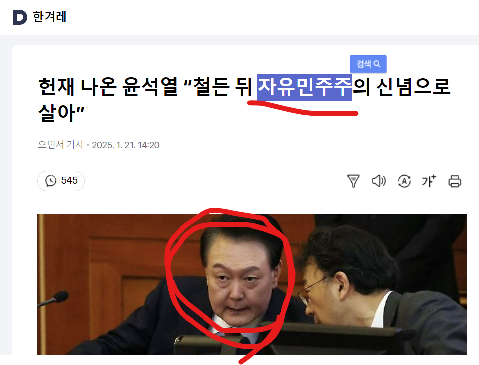 사례1 ; 헌재 나온 윤석열 “철든 뒤 자유민주주의 신념으로 살아” - [출처] 한겨레