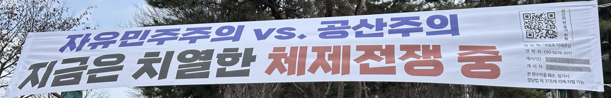윤석열과 부역자집단은 21세기에 메카시즘을 들고나와 '종북세력 척결'을 외치고 있습니다. 아주 역사적인 상대척결 전략이죠. 김대중빨갱이 --> 문재인빨갱이 --> 이재명빨갱이 (지금도 밑바닥에서 카톡을 통해 돌아다녀요.) 이 위험한 메카시즘을 아주 길거리 교차로에 걸어놓았습니다. 이것은 이제 이념을 실물세계로 가져오겠다는 의미인가요?