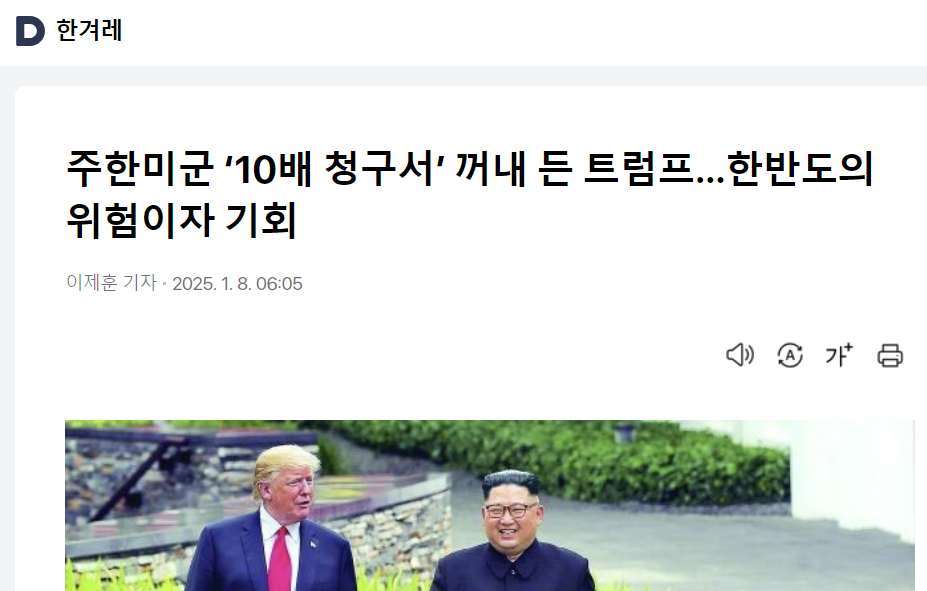 사례3 ; 주한미군 ‘10배 청구서’ 꺼내 든 트럼프…한반도의 위험이자 기회 [출처] 한겨례, 이제훈 기자2025. 1. 8. 06:05