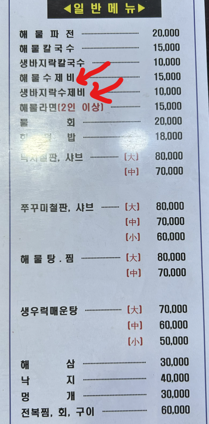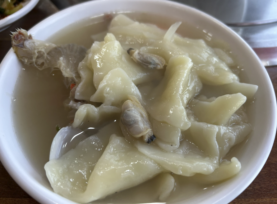 '해물수제비'와 '생바지락수제비'를 섞어서 주문했습니다. 사장님 왈 " 해물수제비 두개시키면 낚지 한마리 수제비에 풍덩 추가하여 나오는데?" 바지락으로 downgrade함으로써 낚지 한마리는 날아갔어요.