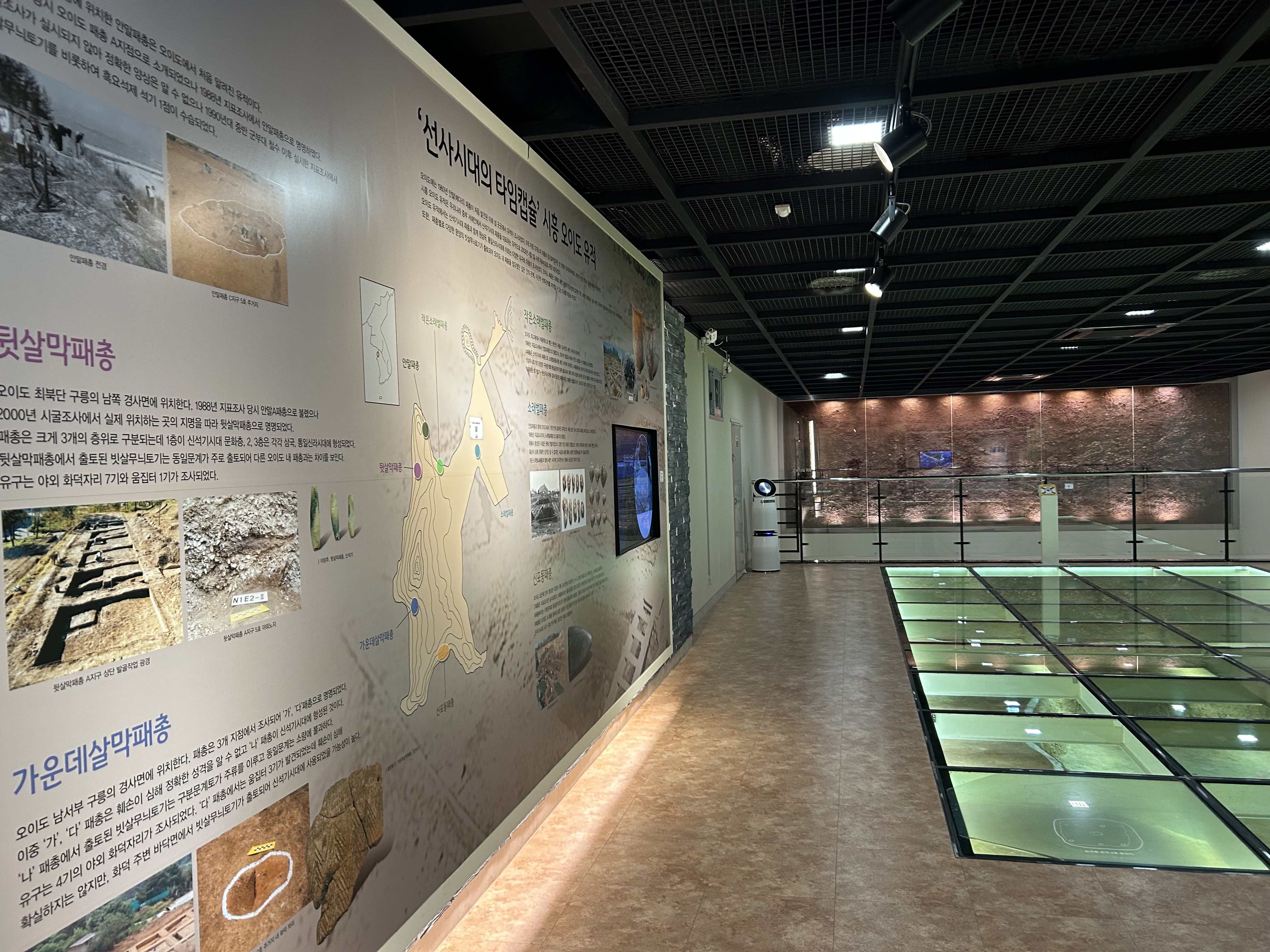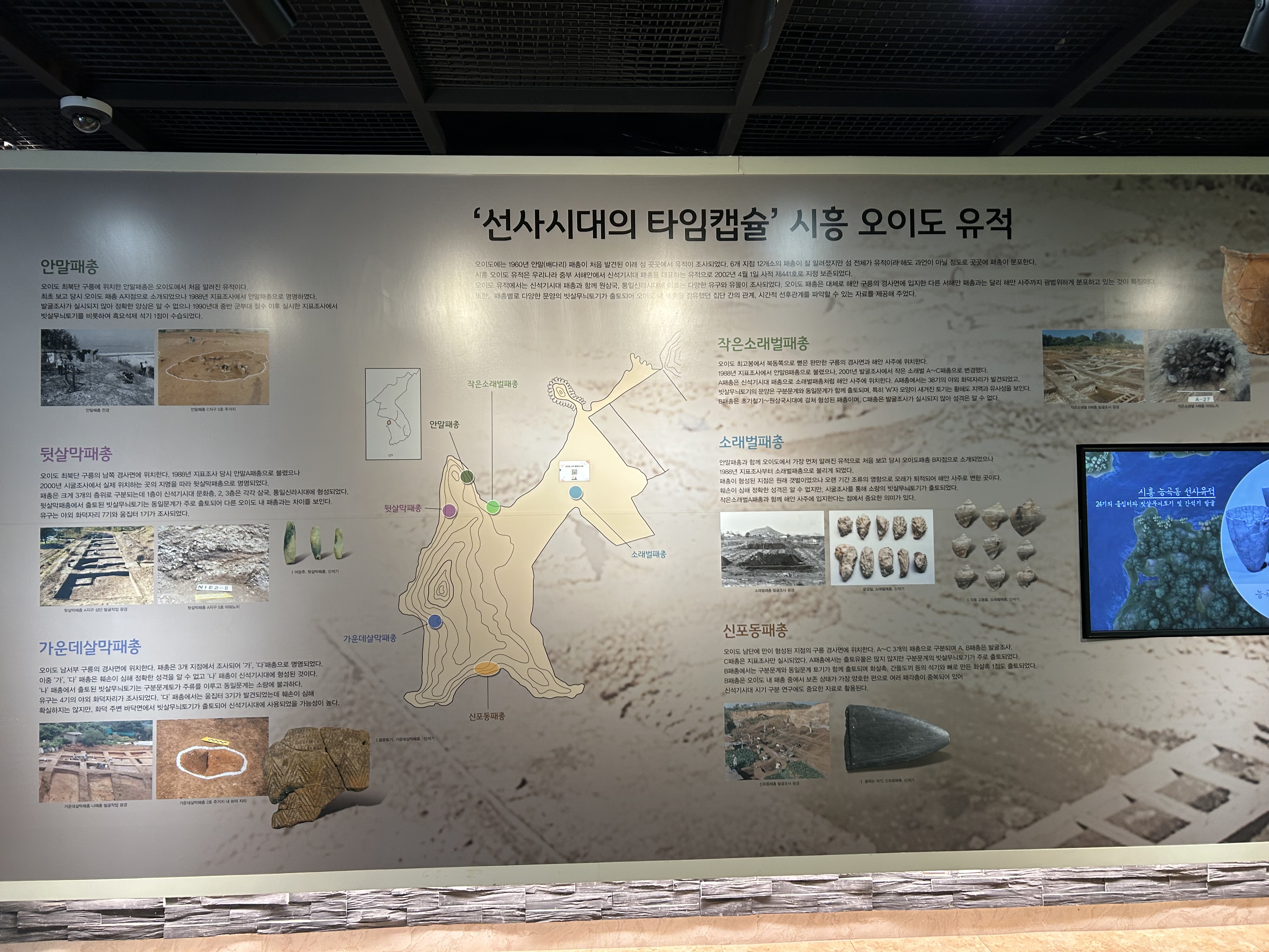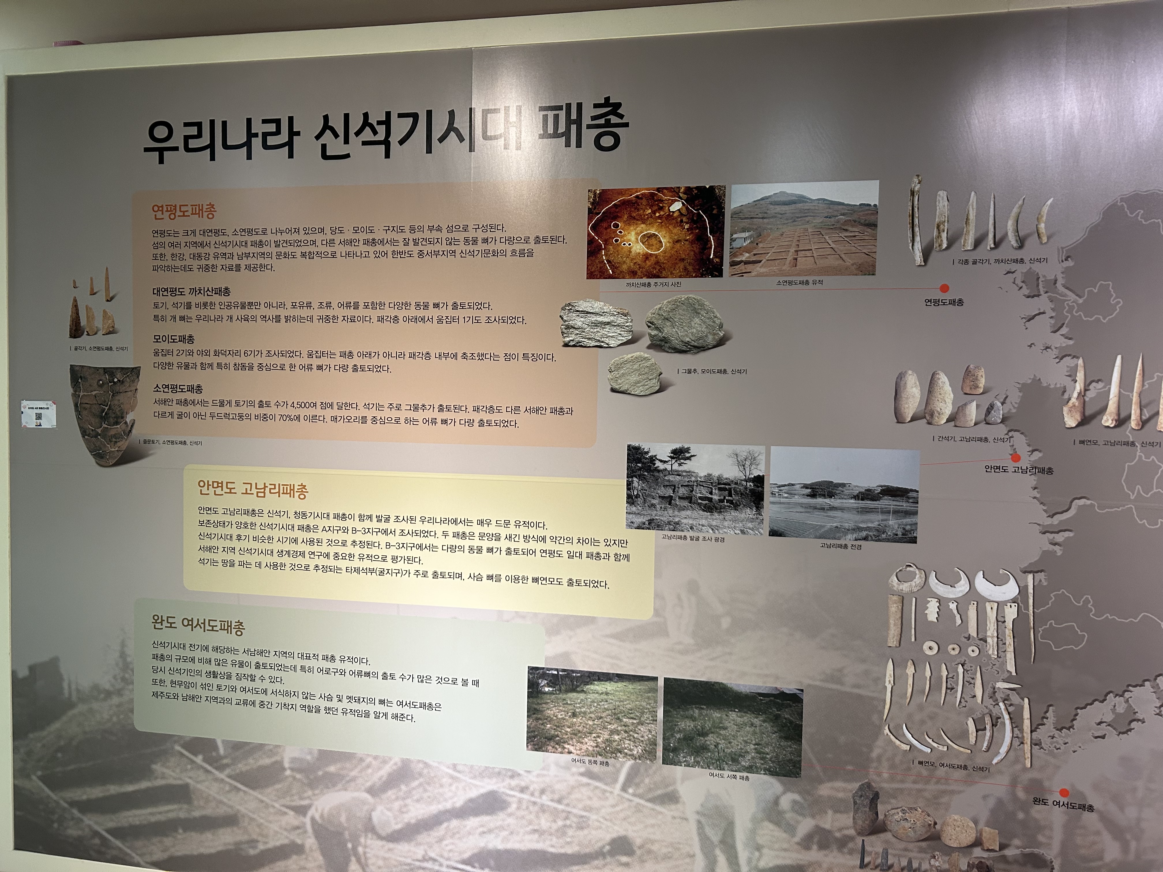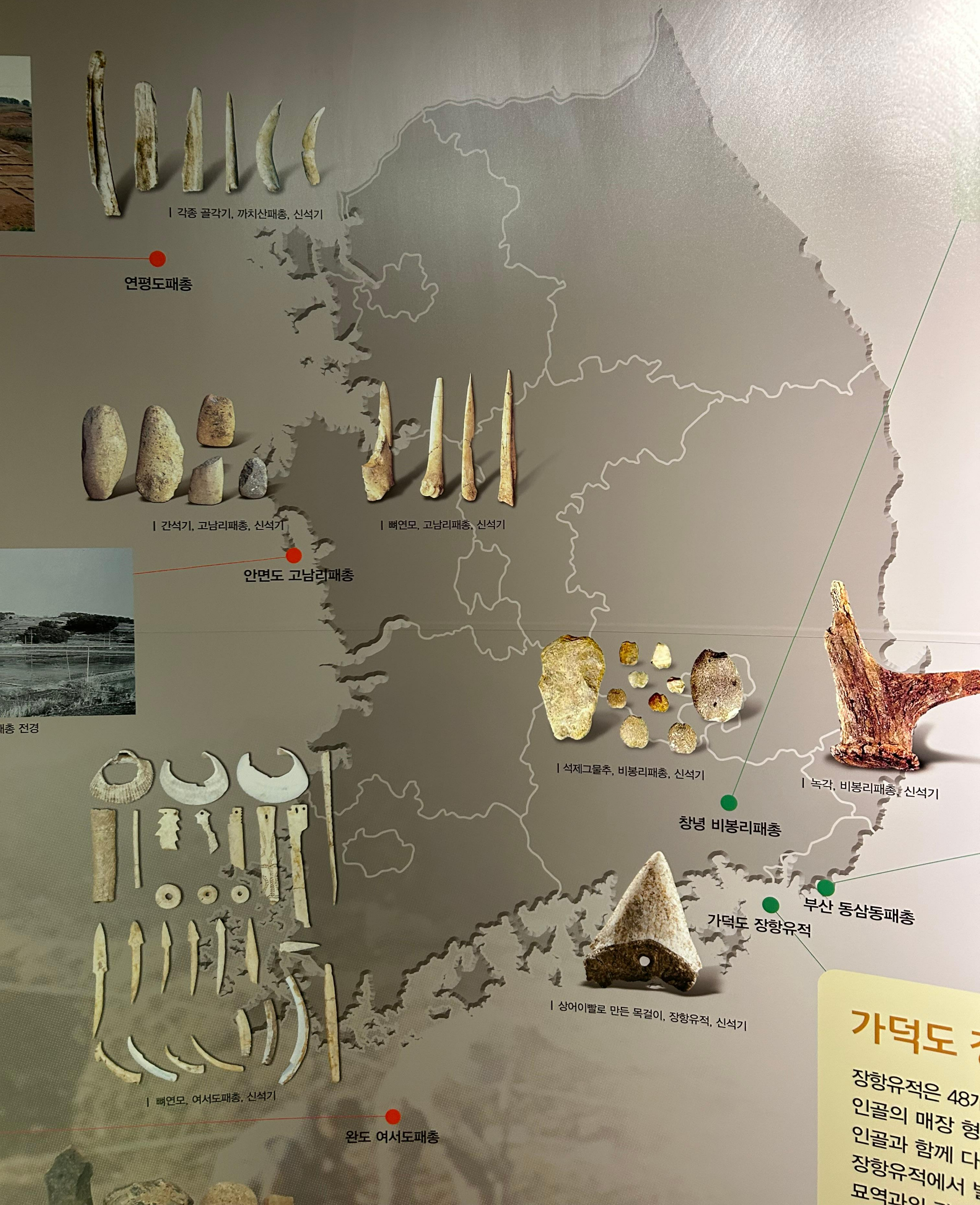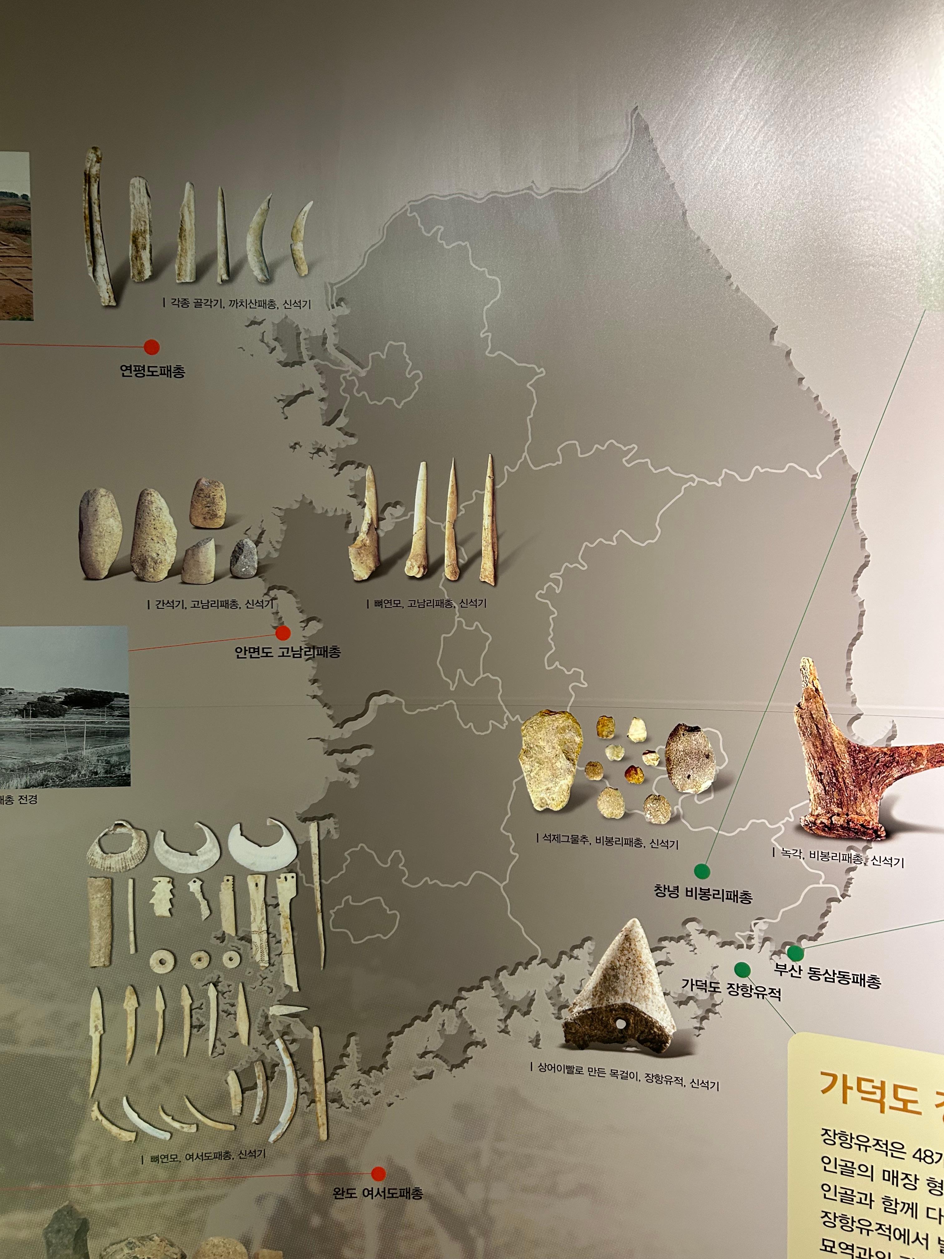 선사시대중 신석기에 해당하는 유물이 발견되었답니다. 패총 흔적, 집자리, 온돌유구, 토기, 석기, 어망추(?) 등의 유물입니다.