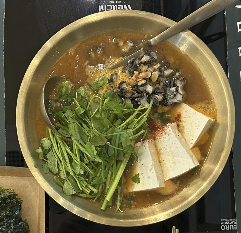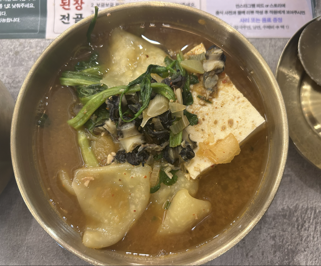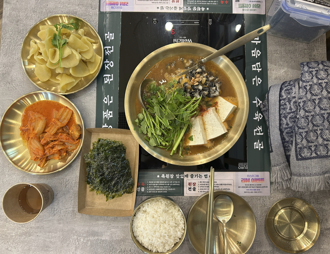 ** {된장, 두부, 김치찜, 바삭김 및 따뜻한 밥 } 이 조합의 맛은 최상! 그러나 {미나리, 우렁, 수제비}의 '식감' 조합은 최악!