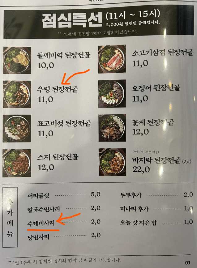 점심특선중 '우렁 된장전골'과 '수제비' 사리를 2인분 시켰습니다.