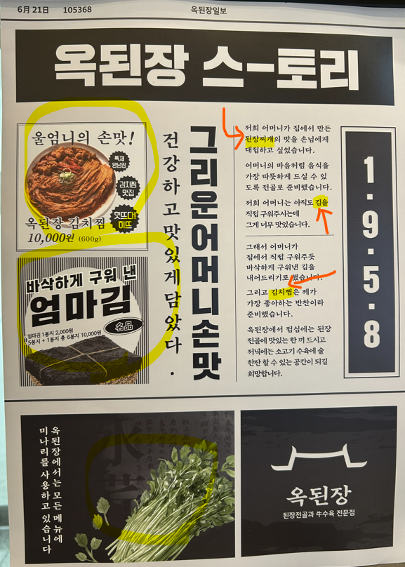 어머니의 '된장맛', '구운 김' 및 '김치찜' 이 모티브가 된 것 같아요. 그럼 그 조합을 먹어야 겠죠~ 미나리는 기본적으로 제공하는 것 같아요. 미나리에 사는 '거머리' 공포증(?) 있는데 ^^