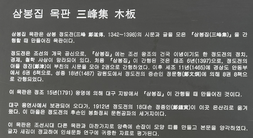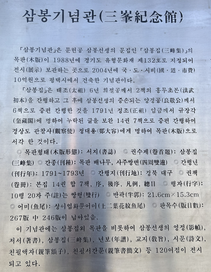 기념관에는 '삼봉집' 인쇄를 위한 266개 목판이 보관되어 있다고 합니다. (경기도 박물관에 2판 보관)