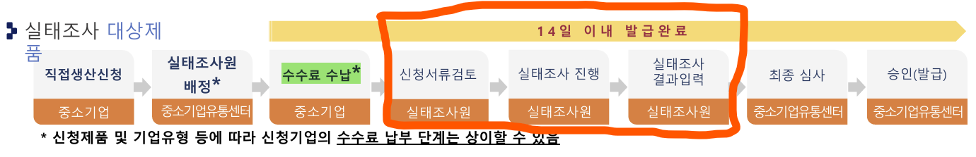 수수료납부 후, 최대 14일 소요되고 붉은색이 배정 받은 조사원이 수행합니다. 현장조사가 끝난 결과보고서와 설비 사진을 등록하면 '한국중소벤처기업유통원' 심사원이 최종 심사하게됩니다. 이 최종 심사 기간은 알 수 없지만 '경험상' 평균 3일 걸립니다.