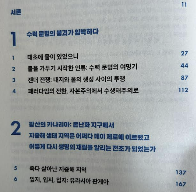 '물'의  존재와 순환 관점에서 서양의 '문명',  '종교', '역사' '문화', '기술', '철학', '예술', '사상' 등 전 영역을 비판하고 대안을 만들거나 변화할 것을 권고해요.  이 주제들이 이 책의 중심 내용입니다.