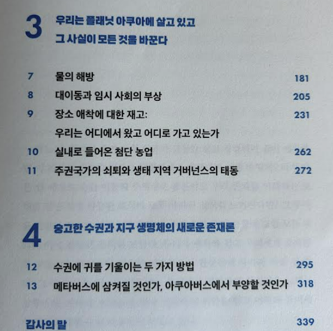 '물'의 존재와 순환 관점에서 서양의 '문명', '종교', '역사' '문화', '기술', '철학', '예술', '사상' 등 전 영역을 비판하고 대안을 만들거나 변화할 것을 권고해요. 이 주제들이 이 책의 중심 내용입니다.