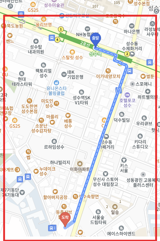 지하철 2호선 '성수역'의 '3번출구' 지역을 탐방했어요. 지도로 보면 다음과 같아요