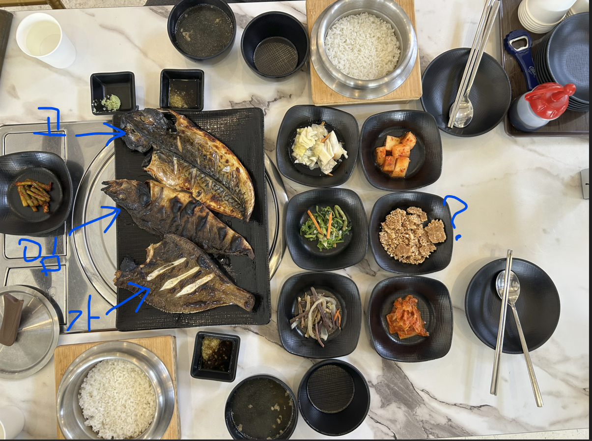 오랜만에 화덕에 구운 생선 3가지 유형을 먹었어요. 생선살의 밀도는 고등어 > 임연수 > 가재미 순서로 높아요. 다른 말로 하자면 가재미가 더 잘 부스러져서 젓가락으로 큰 덩어리 잡아오기가 쉽지 않다는 의미입니다.