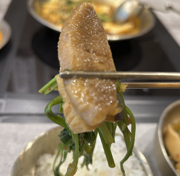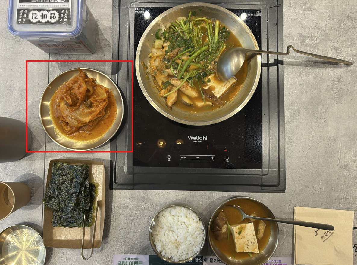바삭 엄마김, 김치찜 그리고  표고버섯 된장도 조화로와요.  그 순서로 로봇같이 착착착 진행하여 다 비웠습니다. 그런데 김치찜이 먹을수록 짠 느낌(?)이 있어요. 이상하네? 프랜차이즈인데?  바닥에 남은 것을 가져온 것인가?  아무튼 짠 느낌이 나요~. 지점별 관리 방법에 따라 다를 수 있겠죠!