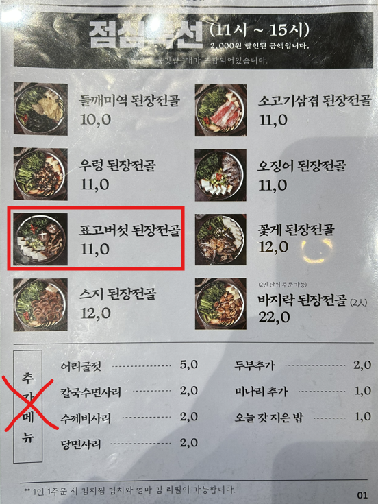 주문메뉴 표고버섯된장전골 우렁된장전골