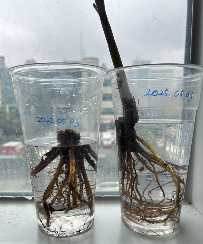2025년 01월 29일에 모체에서 떼어낸 두 촉중 한 촉은 죽은 것 같고 다른 한쪽은 성장이 멈춘 것 같아서 물 꽂이하기로 결정했다.