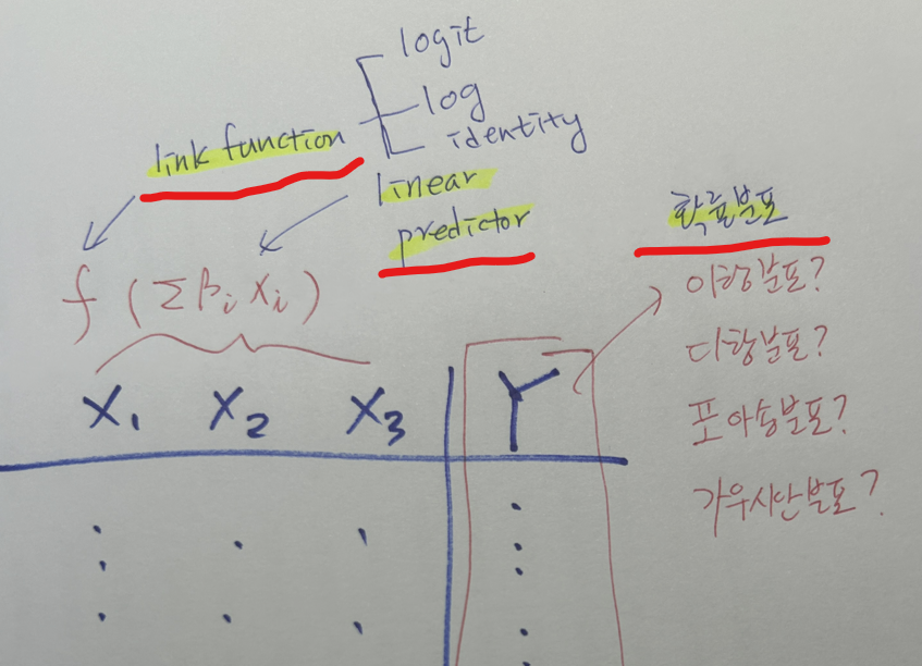 - 확률분포 P(Y)= link function 함수 (linear predictor함수)