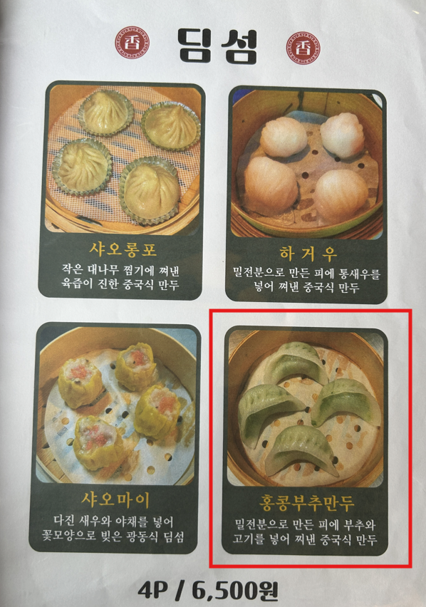 수제딤섬 4가지 종류중 '홍콩부추만두'를 주문했어요.