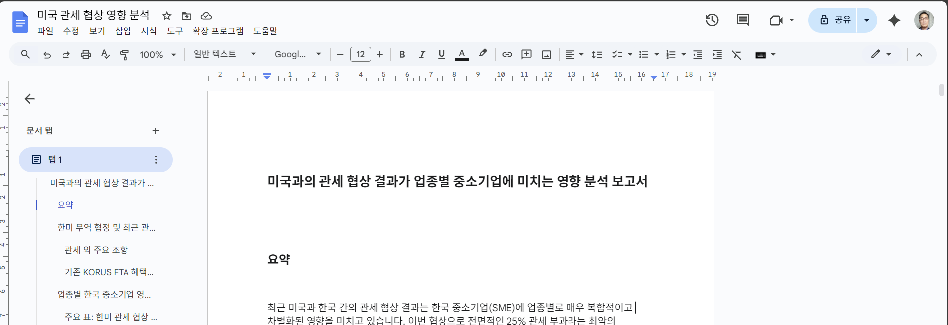 이에 구글 AI에게 '미국과의 관세 협상 결과가 업종별 중소기업에 미치는 영향 분석 보고서' 를 작성해 보라고 하였습니다.