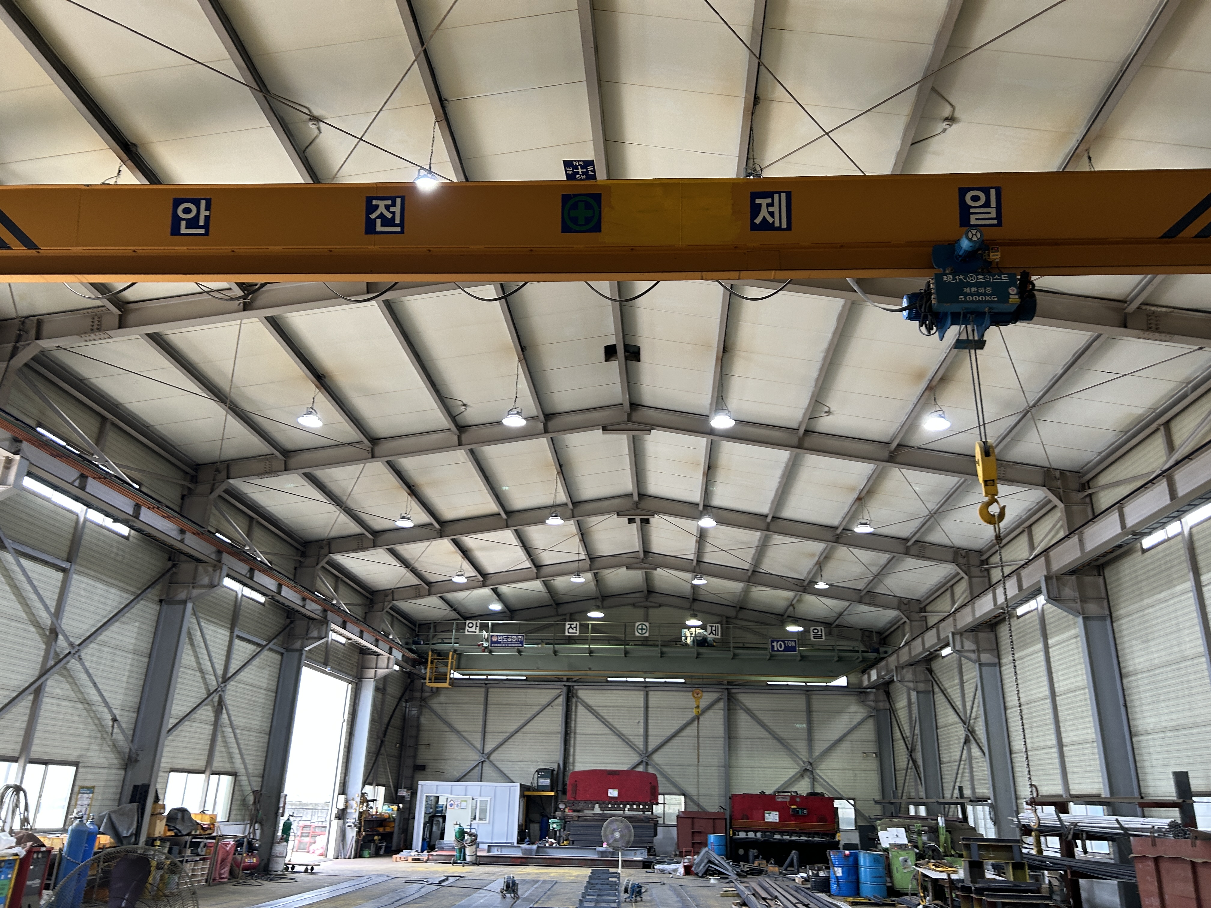 천정에 설치되어 무게가 매운 무거운 철근, 반제품 및 완제품 등의 중량물을  전후좌우상하로 공간 이동시켜주는 설비인데....요렇게 생겼습니다.  천장크레인 만드는 제조기업에 달린 천장크레인입니다. 자신들이 만드었겠죠. 저 노란색 가로 철근을 '거더'라고합니다. 양쪽은 이동에 필요한 '레일'이 있겠죠.