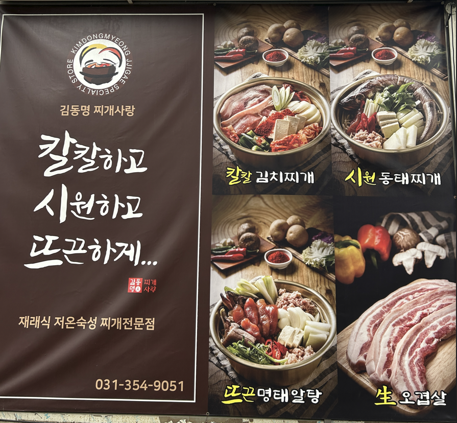 경기도 화성시 향남읍 구문천리 924-7에 위치한 '김동명찌개사랑' 구문천 직영점을 방문했어요.  오늘 이른 아침 온도가 19도까지 내려갔어요. 그리고 비가 오네요.  그럼 뜨듯한 '동태찌개' 생각이 나서....