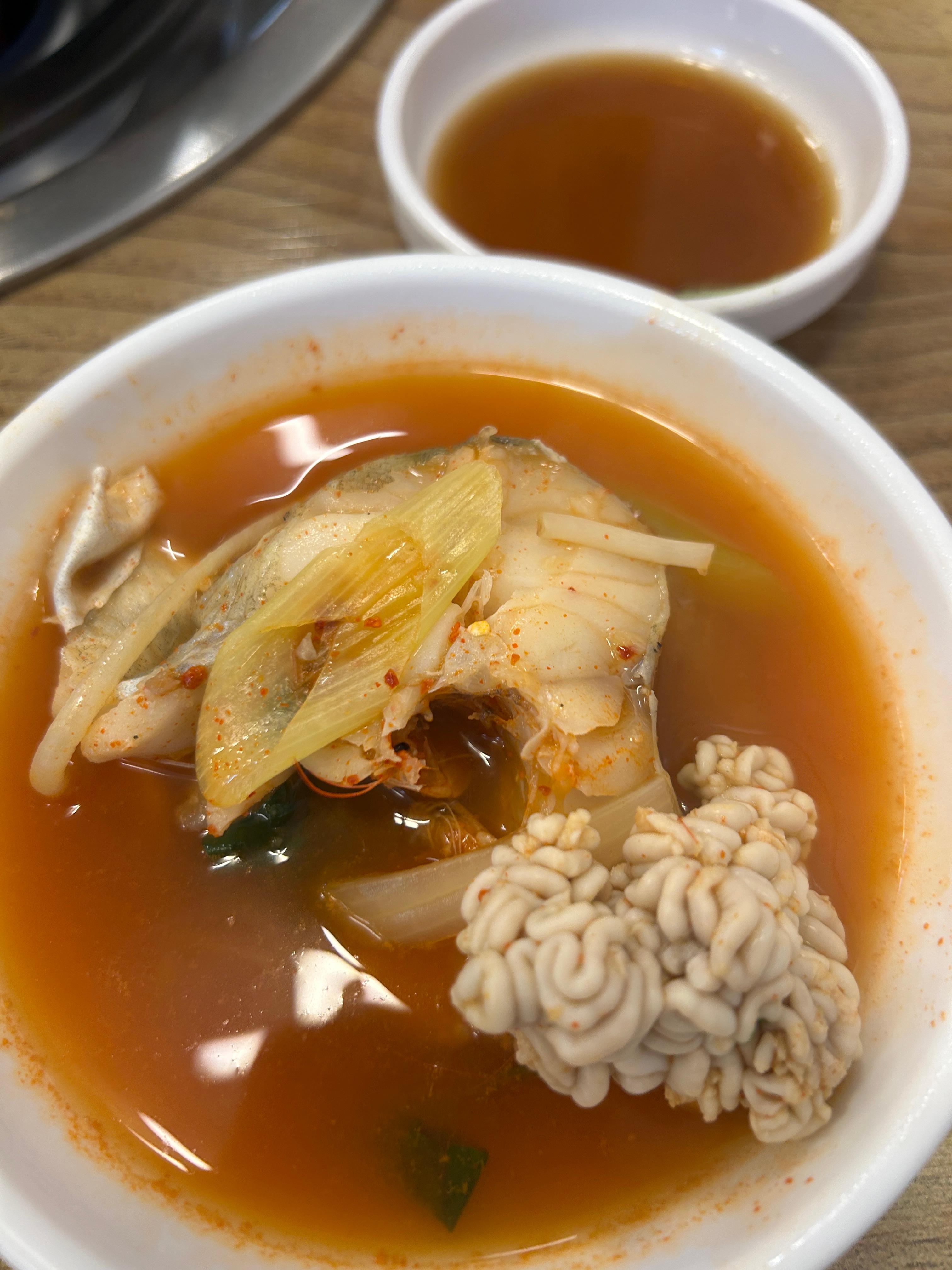 작은 새우, 무, 미나리, 두부, 고추, 파가 들어가 있네요.