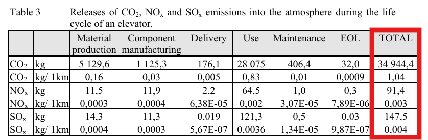 엘리베이터 1대가 Material(원재료)부터 수송, 제조, 사용, 유지보수 및 폐기까지의 단계별 CO2, NOx, SOx 배출량은 아래 표와 같이 나오네요. LCA (Life Cycle Assessment)를 학습하다보니 궁긍하여....ㅎㅎ