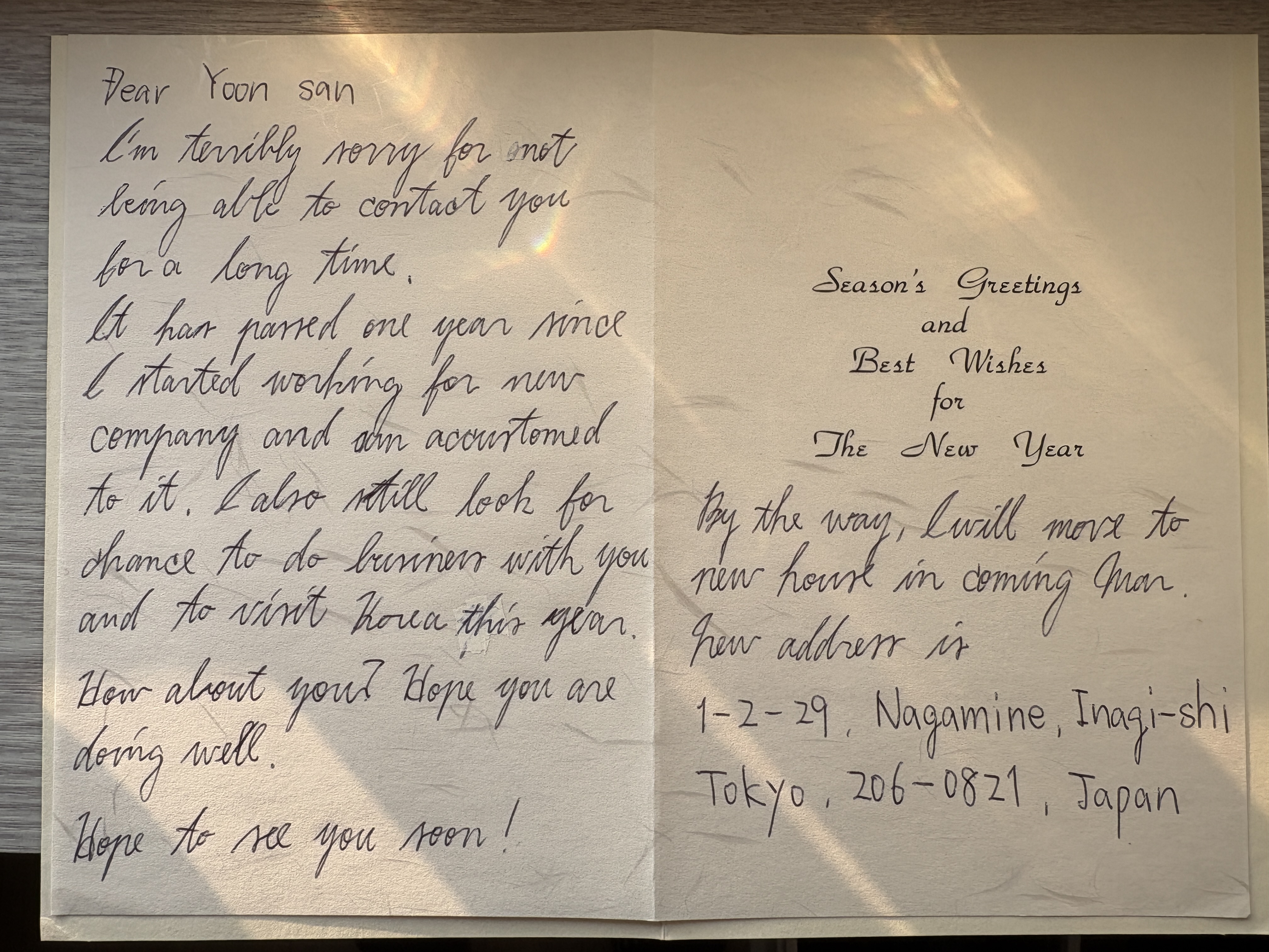 Dear Yoon san I'm terribly sorry for not being able to contact you for a long time. It has passed one year since I started working for new company and am accustomed to it. I also still look for chance to do business with you and to visit Korea this year. How about you? Hope you are doing well. Hope to see you soon!