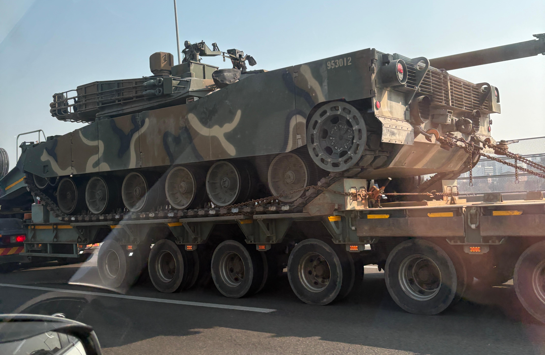 가는 도중 도로에서 K2 흑표 포착했어요. 넙적하니 눌린 모양이니 K2 흑표 같은데 맞나요?  전투중량: 56톤이라고 되어있는데 저 것을 어떻게 싣고 가나요?  이동 차량이 더 신기하네...ㅎㅎ