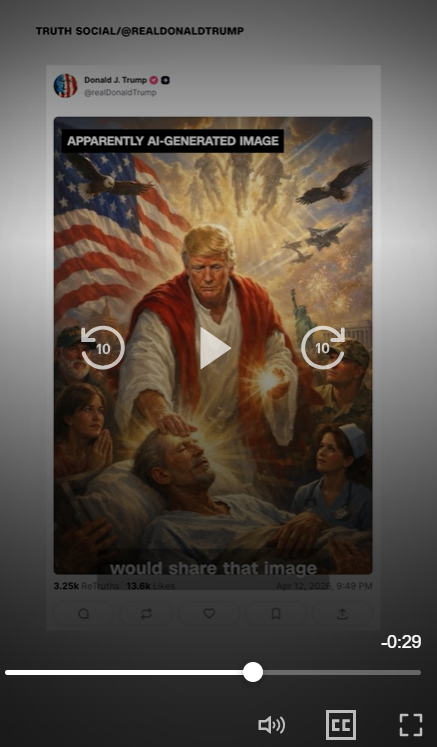 - 트럼프 대통령은 이달 12일(현지시간) 트루스소셜에 흰색 옷과 붉은 망토를 두른 채 누워 있는 한 남성 이마에 손을 올리고 있는 자신의 합성 사진을 올렸다.