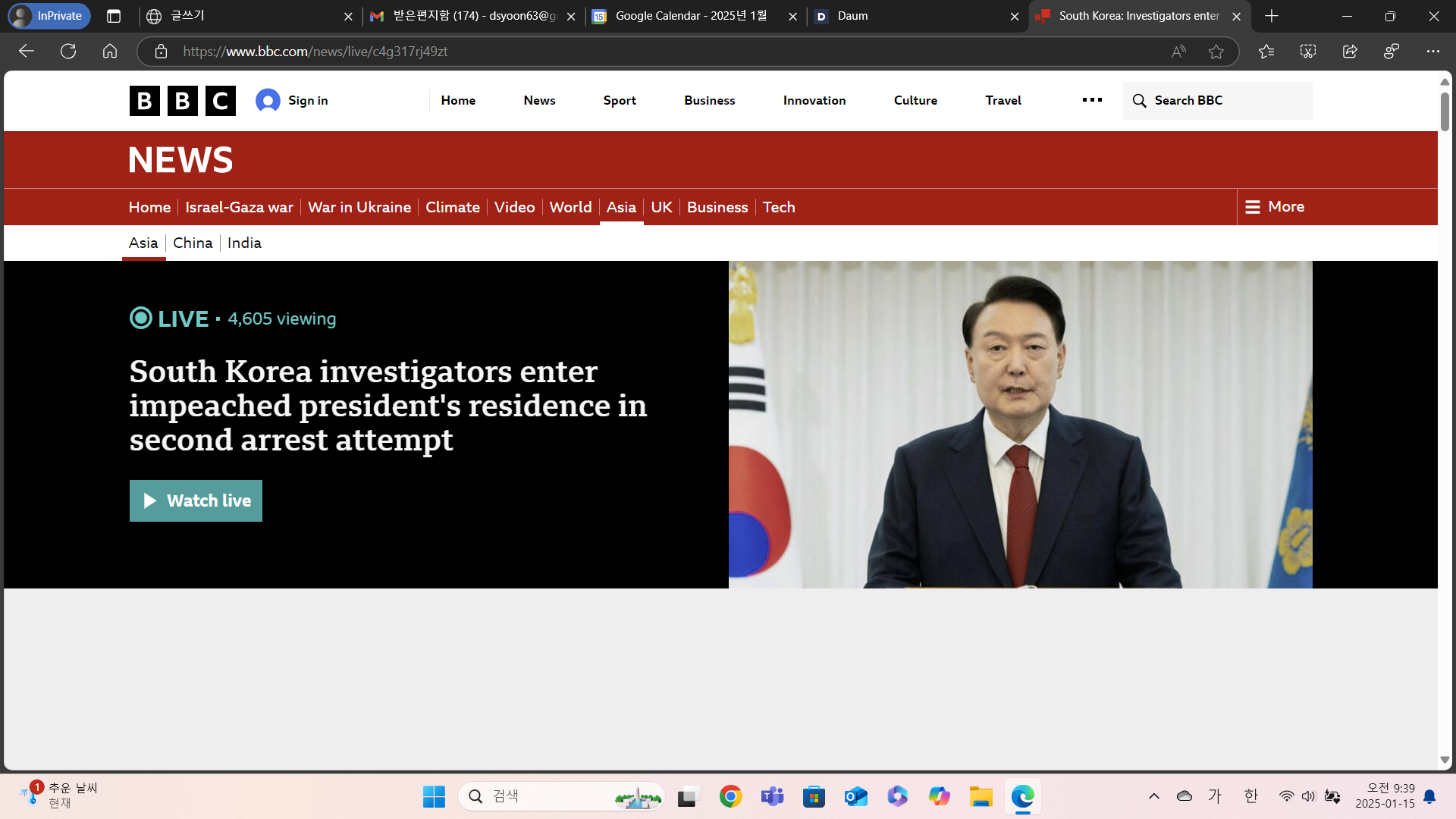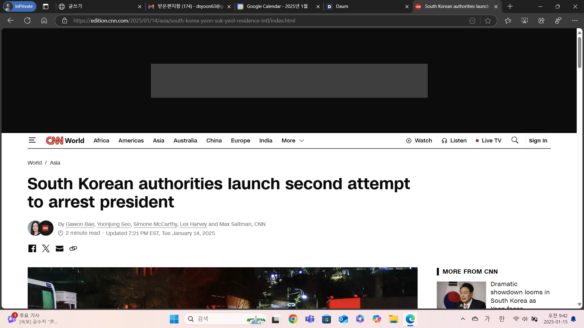 미국 CNN방송은 "궁지에 몰린 윤 대통령의 충격적인 계엄령 선포로 시작된 정치적 결전의 최신 뉴스"라며 "윤 대통령은 몇 주 동안 대통령경호처에 둘러싸여 요새화된 관저에 숨어 있었다"고 설명했다.