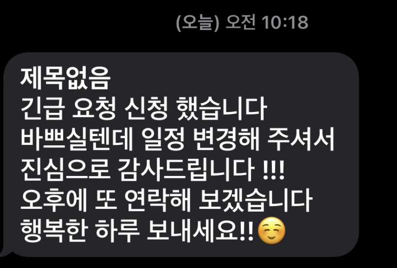 A대표는 작전 스케줄대로 한국중소벤처기업유통원 심사관에게 전화 후 문자 보내왔어요. 오후에 연락한다고 하니 우리 스케줄대로 착착 진행됩니다.^^
