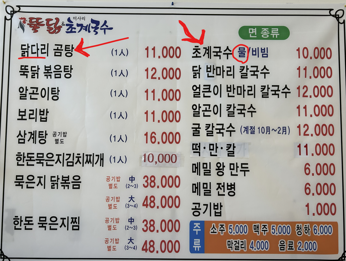 '닭다리 곰탕' 하나와 '초계국수(물)' 을 주문했어요. 초계국수는 주변에 하는 곳이 별로 없어서 먹어본지 10년이 더 된 것 같아요. 초계국수는 차가운 닭고기 국물에 밀면 사리와 닭가슴살을 언져 먹는 여름 보양식이예요. 먹어보고 싶은 특이한 메뉴도 여럿 보여요. '알곤이 칼국수', 알곤이탕', '굴 칼국수', '떡·만·칼' 이예요.
