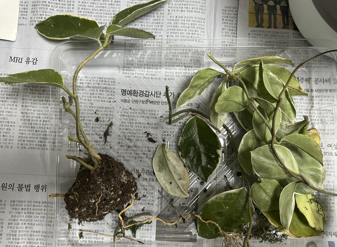 호야와 고무나무의 모습은 위와 같다. 수분의 흔적이 없고 흙은 말라서 부셔지는 상태다. 고무나무는 뿌리가 빠져나와 옆으로 누워있다. 이제 간이 수술을 시작하자.