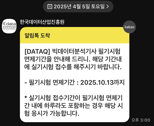 한국데이터산업진흥원으로 부터 빅데이터분석기사 유효기간 안내 카톡이 왔어요. 화들짝~~