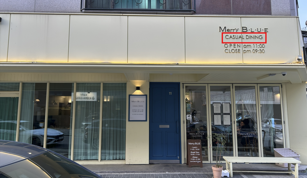 막내 생일이라 좋아하는 '스테이크'를 사주려고 경기 안양시 동안구 동편로183번길 11에 위치한 메리블루 (Merry B.L.U.E)를 방문했어요. 4~5층 짜리 다세대 주택의 1층에 위치하고 있어요.