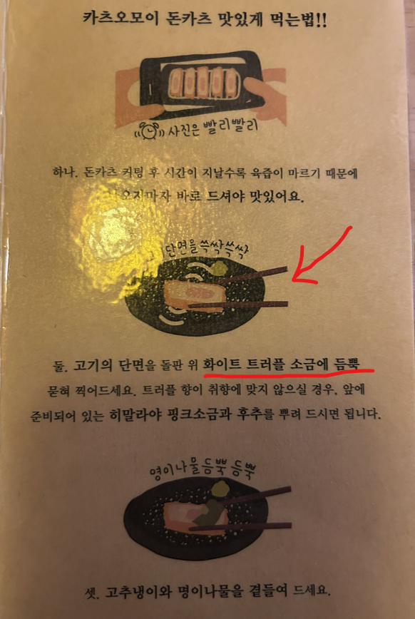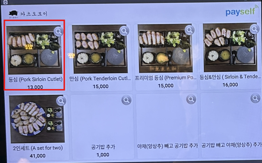 담당자 '명'을 따라 키오스크로 등심 돈가스(₩13,000) 주문했어요. 그런데 '트러플소금' 찍어 먹으라는 '명'이 있네요?