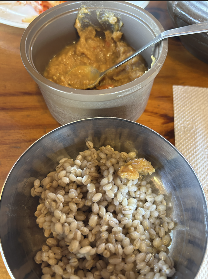 오호 이게 먼가요? 애피터이저로 호박죽과 꽁보리밥인데...무엇에 비벼 먹는고??? 나물주나?