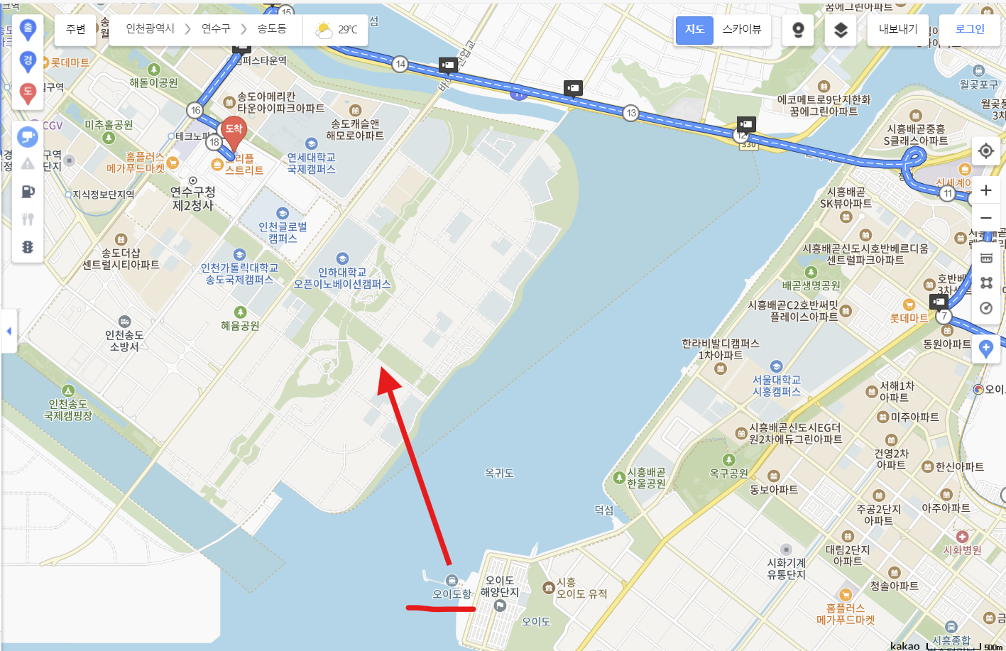 직생으로 자주갔던 시흥시 오이도항의 건너편이 인천광역시 연수구 송도동입니다. 바닷길 따라 가네요. 배에 싣고 가는 방법은 없을까요? ^^