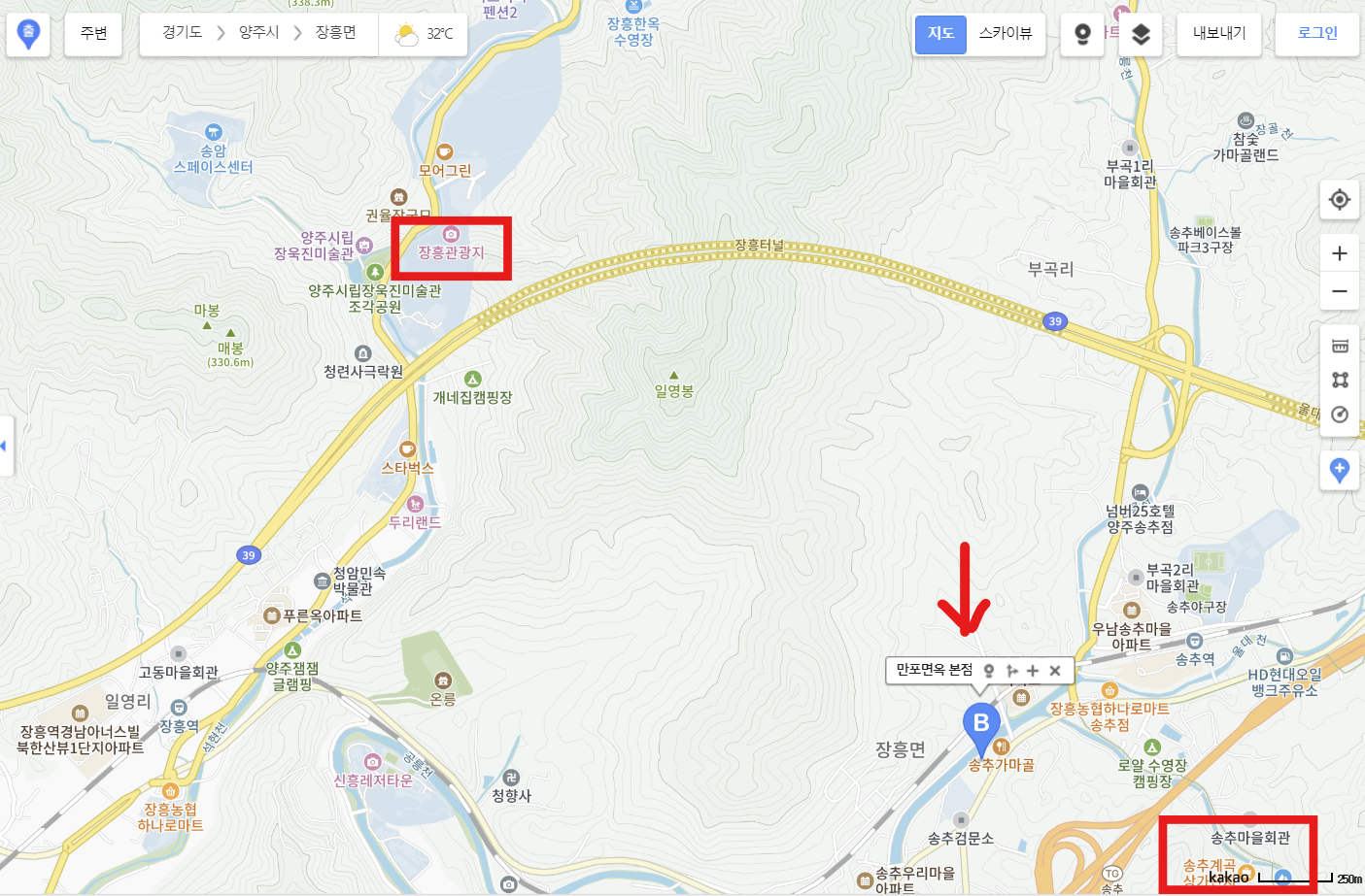 '장흥관광지'와 '송추계곡' 사이에 위치한 곳(경기 양주시 장흥면 호국로 515 1층)이예요. '장흥'과 '송추'는 20대 젊은 시절 MT하러 자주 갔던 곳이라 감회가 새롭네요..^^
