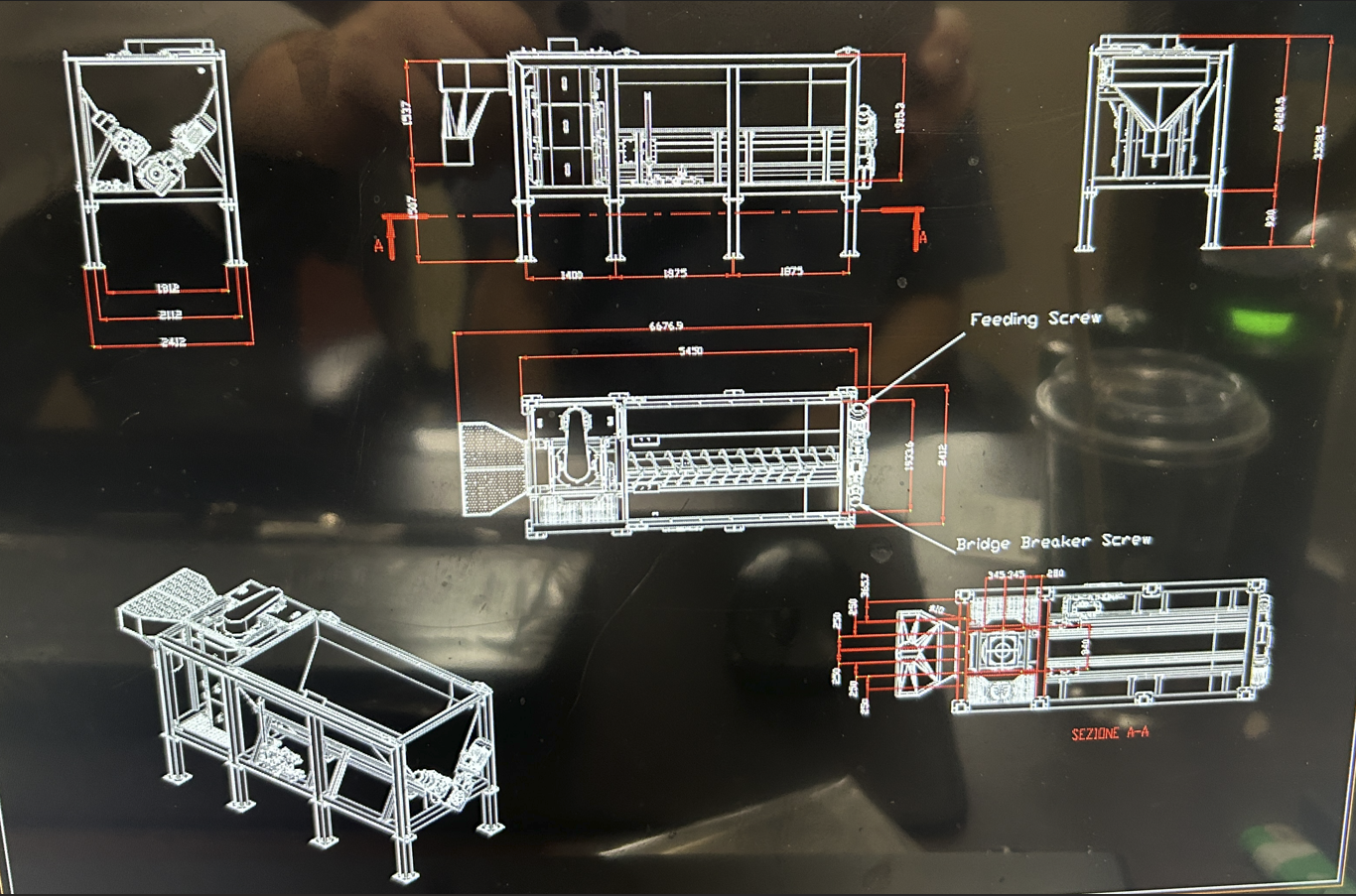 CAD 모양은 요러합니다. 다 철근으로 튼튼한 구조에 회전하면 갈아버리는 screw 컨베이어가 장착되어 있습니다.