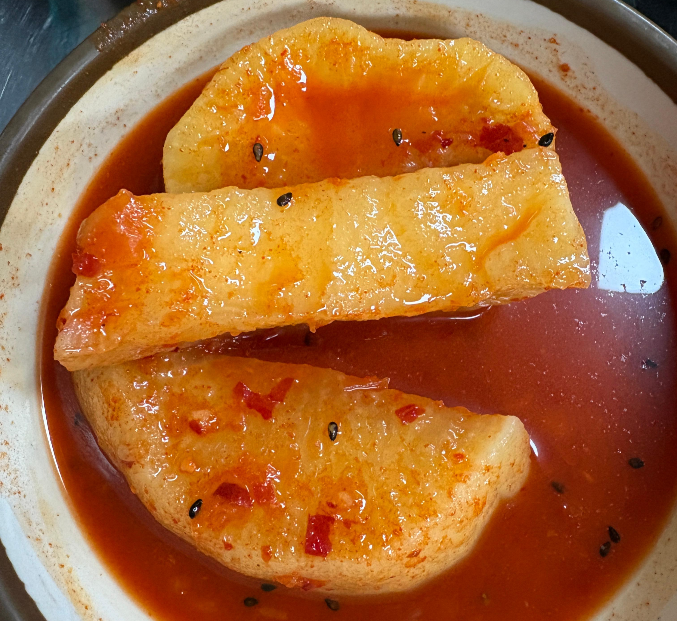 - 무우와 김치는 '항아리'에 담겨있던 것 처럼 아삭아삭 거리고 달콤한 맛도 나요.