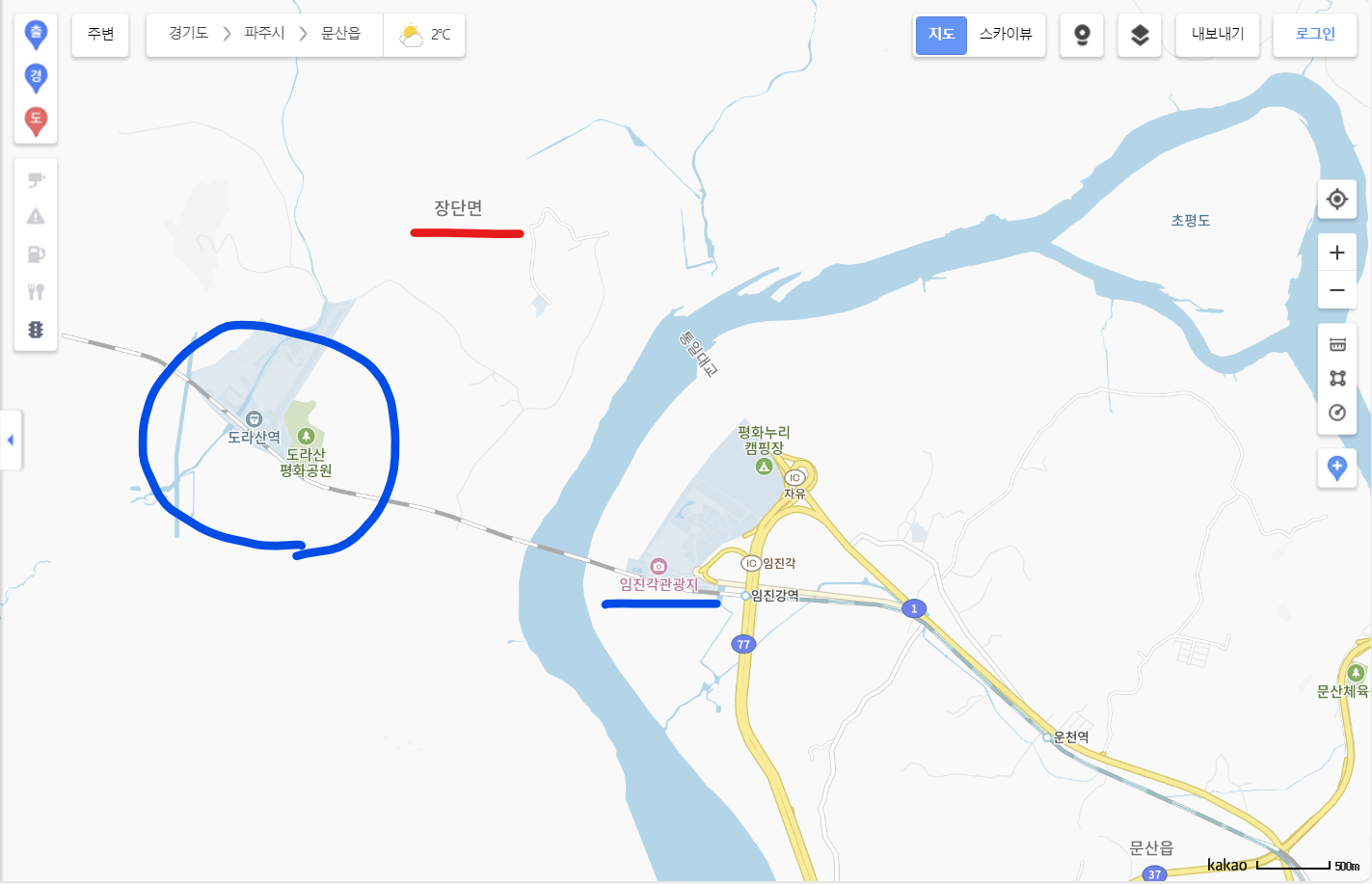 장단면에는 경의선 전철의 마지막역인 '도라산역'이 있네요.