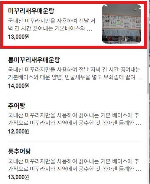 '미꾸리새우매운탕' 2개 주문했습니다. 솥밥이 포함된 가격입니다. 내용 기술에 '국내산 미꾸라지만을...' 표기가? 후에 물어봐야겠네요. 내 미꾸리는 어디에?