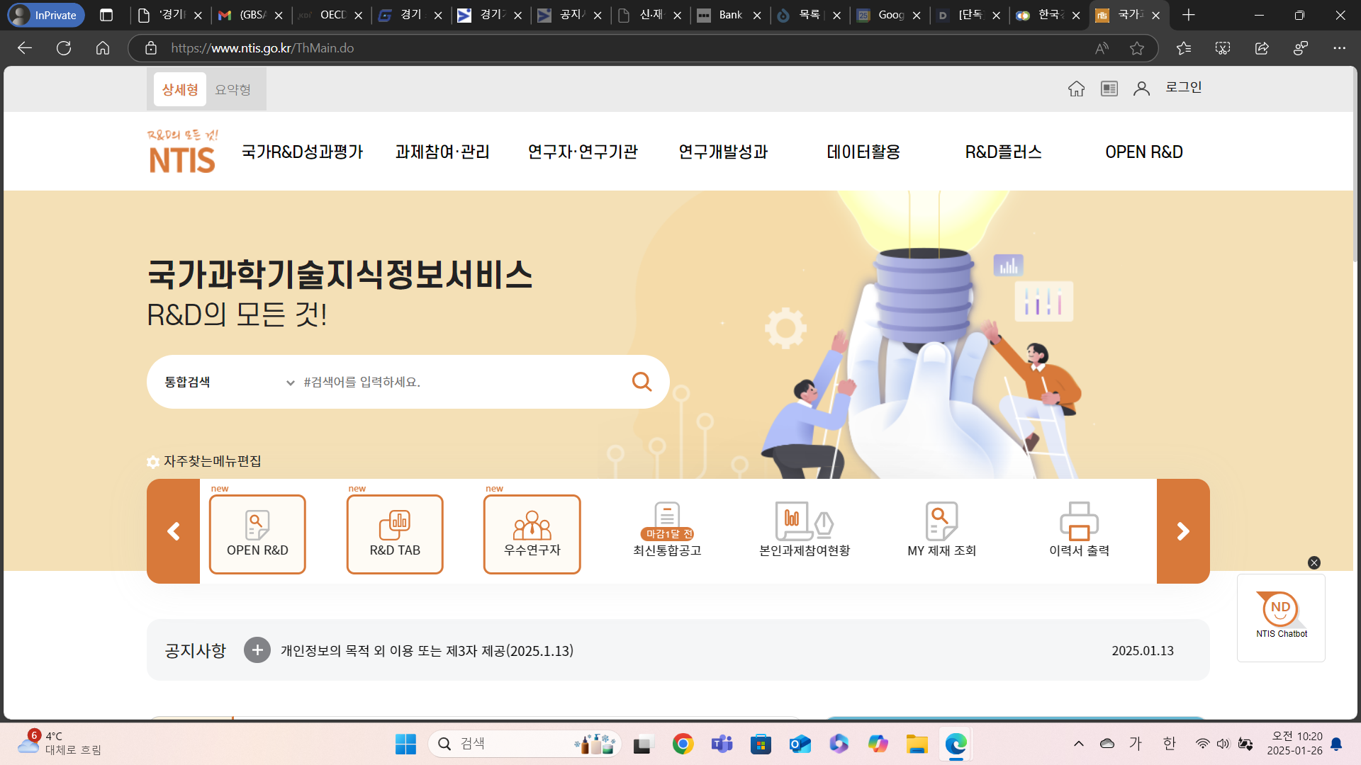 NTIS( National Science & Technology Information Service) 를 한마디로 정의하자면 '국가 R&D 관련된 정보의 모든 것을 서비스하는 포털이다.' 라고 할 수 있습니다. '국가(National)'란 용어를 사용한 이유는 정부 18개 부처 및 청의 R&D 관련 연구기관이 모두 참여하기 때문입니다. R&D 계획, R&D 과제 참여, 등록, R&D 과제 성과, R&D 과제 평가 및 R&D 통계 등의 정보를 일괄 제공하며 과학기술정보통신부의 산하기관인 KISTI (한국과학기술정보연구원) 와 KISTEP (한국과학기술기획평가원)이 관리운영합니다.