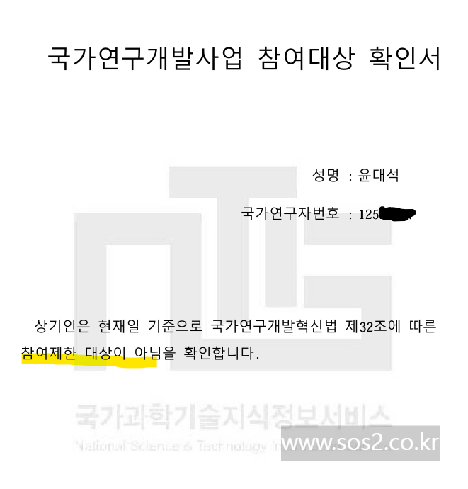 'NTIS 제재확인서'는 국가 R&D에 참여한 연구자 중 부정을 저지른 이력을 확인하는문서입니다. 본인은 연구자 번호가 있어서 NTIS에서 확인서 발급이 가능합니다.
