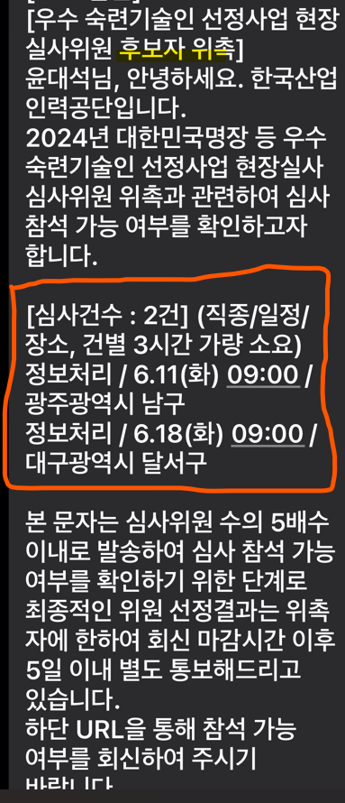 늘 그러하듯이 문자가 옵니다. 이 경우는 직종은 '정보처리'이고 광주광역시와 대구광역시 두곳을 현장실사 다녀와야하는 일정입니다. 전국 투어죠. 5배수 이니 선정 된다는 보장은 없습니다. 2025년에는 [슬기로운 평가 생활]의 생각으로 열심히 다녀오도록 하겠습니다.^^