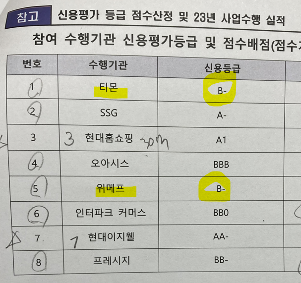 당시 발표에 참여한 티몬과 위메프가 대금지연정산 사고를 치고 말았습니다. 평가에는 외부 기관의 신용평가 점수가 사전 배포되는데 보시다시피 B- 로 최소 신용등급이였습니다. 경찰 조사에 안불려 간 것을 보면 아마 내가 이 두업체에 최소 점수를 준 것 같은데요...ㅎㅎ ^^