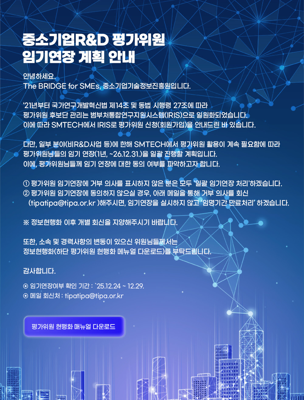 중소기업기술정보진흥원[TIPA] - 중소기업R&D 평가위원 임기연장(~'26) 완료